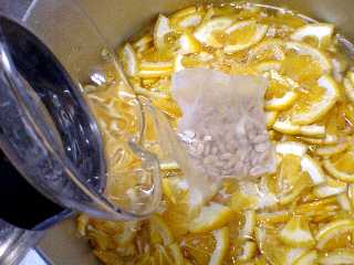 ふぁ〜〜、ねむい。一晩たった模様 随分しんなりしてますねぇ、ここで水 8カップ(約1600cc)入れましょう。甘 夏1個に付き水1カップと覚えておく といいですね。白ワインも香りづけで 加えます。入れなくてもいいんだ。 ああ忘れるとこだった。さっこちゃん あの厚皮のスライスどうした?そう、 渋抜きしてたヤツ。それそれ、水気 を切って一緒に入れちゃいましょ。 さあいよいよ火入れです。中〜強火 で沸騰させます。 |
